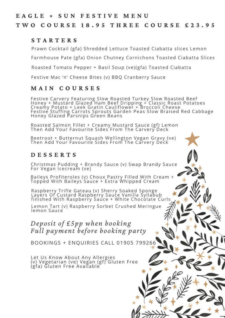 Check out the Special Eagle and Sun FESTIVE MENU for the build-up to the Big day - Two Courses £18,95 - Three Courses £23.95 Booking Essential* 01905 799266