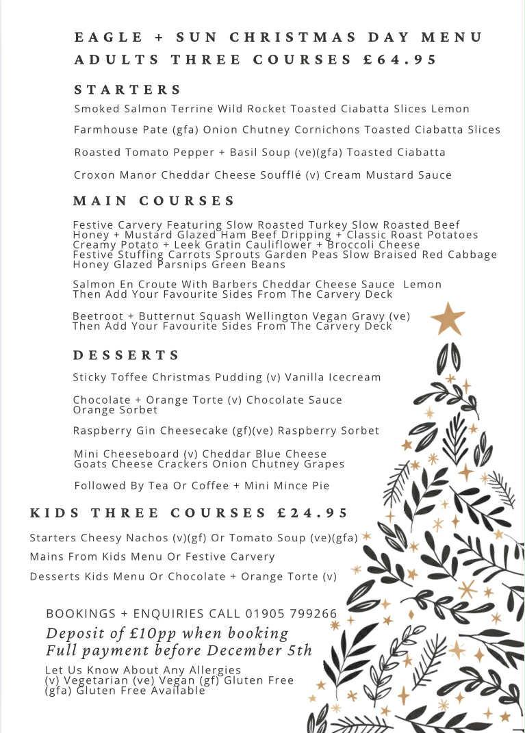 And The Big One! The Eagle and Sun CHRISTMAS DAY MENU. Adult Three Courses £64.95 - Kids Three Courses £24.95 Booking Essential* - Limited Availability 01905 799266
